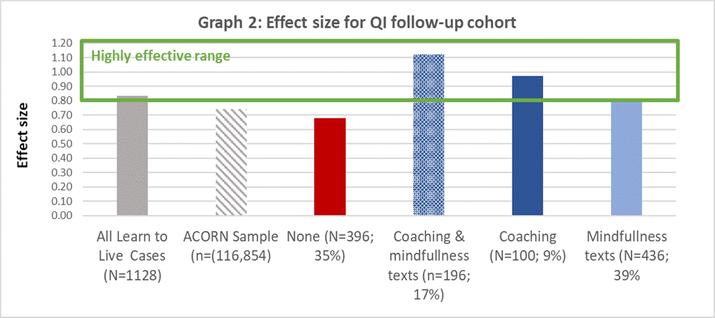These are real world findings, and the lack of random assignment with a control group make any interpretation a matter of speculation. The clinicians and technical staff with Learn to Live are constantly enhancing the platform to make it more engaging. They also craft mindfulness text messages with the intent of making people feel they are getting personal therapeutic input, and these are modified over time. While these results are encouraging, it cannot be concluded that these quality improvement efforts caused these results.