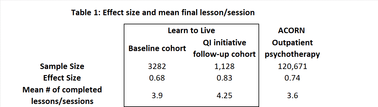 Treatment outcomes can be evaluated for those completing treatment (which is seven lessons for Learn to Live modules) or as the “intent to treat” based on the last lesson completed. The intent to treat method results in smaller effect sizes given the failure to complete all lessons, but the calculation more accurately reflects the experience of most users. For this reason, the intent to treatment method is employed, and this includes reporting effect size for those ending treatment at each lesson.